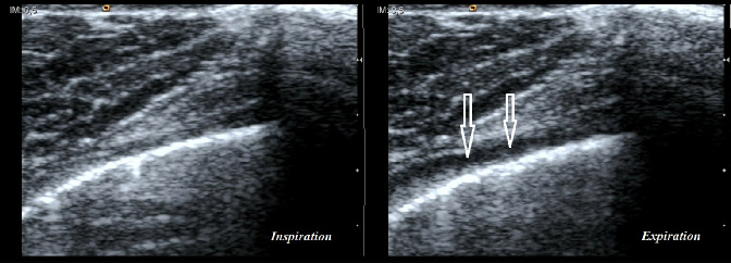 Coupes intercostales d’un épanchement pleural millimétrique lors d’une “ manœuvre de facilitation ”. La première image (image de gauche), en inspiration, rend difficilement visualisable (flèches blanches) la présence d’un liquide qui apparaît à l’expiration forcée (image de droite)