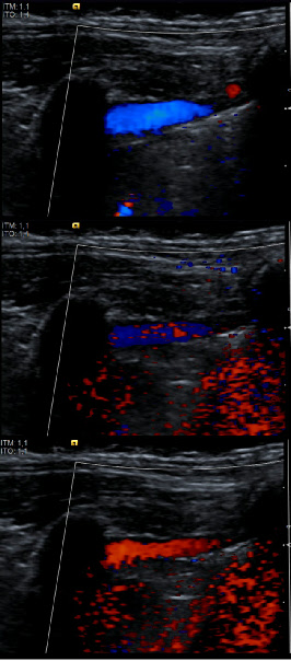 Enregistrement en mode Doppler couleur d’un épanchement pleural minime. Images consécutives d’un enregistrement au cours de la cinétique diaphragmatique révélant le flux liquidien intrapkeural