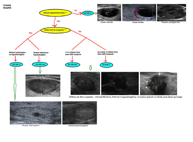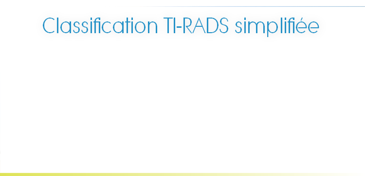 La nouvelle version simplifiée du score TI-RADS (Dr Gilles RUSS, Open Journal of Radiology, 2013) est basée sur la présence ou non d’un ou de plusieurs signes forts de suspicion suivants :