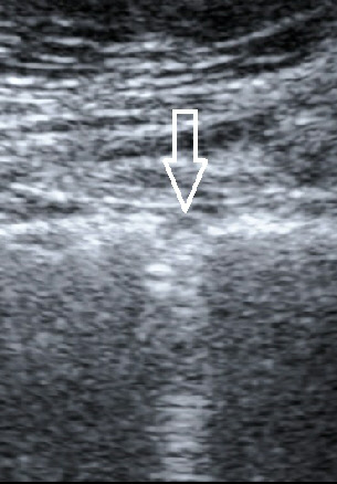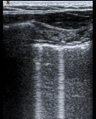 Celle d’une coupe longitudinale montrant un syndrome alvéolaire a minima avec, en arrière d’une couche superficielle d’alvéologrammes hydriques à peine visibles, la présence d’alvéologrammes hydro-aériques sous la forme d’impuretés postérieures (rings downs nombreux et plus marqués que les rings downs habituels du poumon normal) formant une “ trop belle image postérieure ” générée à partir d’une surface pulmonaire parfaitement mobile.