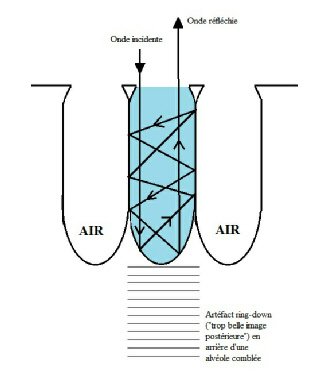 Coupe longitudinale présentant un syndrome alvéolaire a minima. Juste en arrière de très minces alvéologrammes hydriques en superficie, mise en évidence d’alvéologrammes hydro-aériques reconnaissables aux impuretés postérieures en queue de comète (formant de “ trop belles images ” artéfactielles).