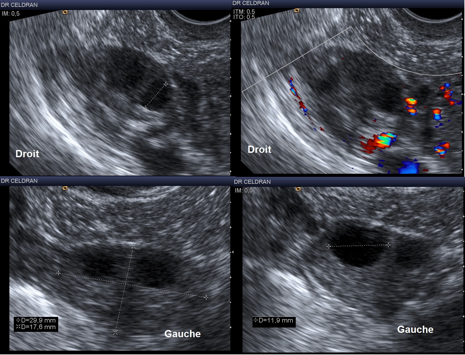 - En associant les voies endovaginale et sus-pubienne, on peut considérer toutefois qu’un ovaire au moins est visible dans 95% des cas, que les deux ovaires sont visibles dans 80 à 90% des cas.